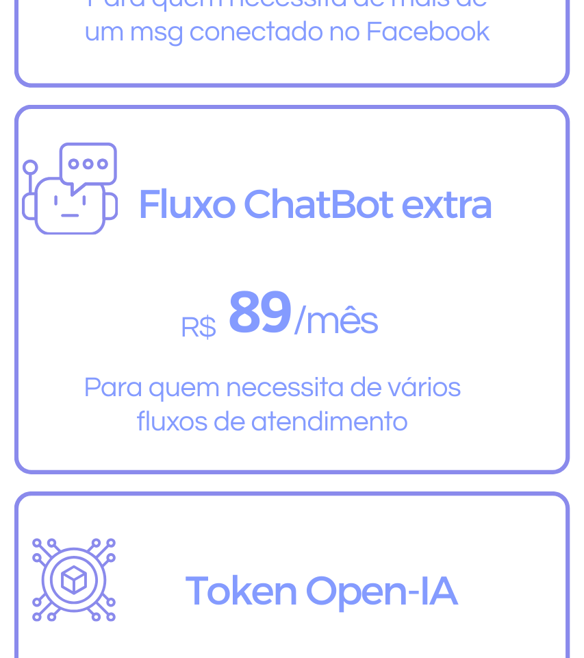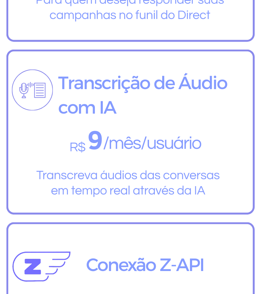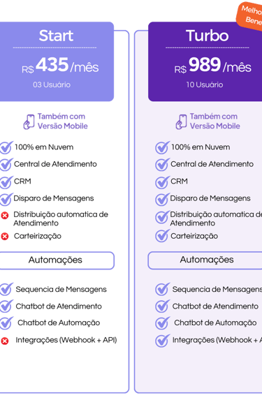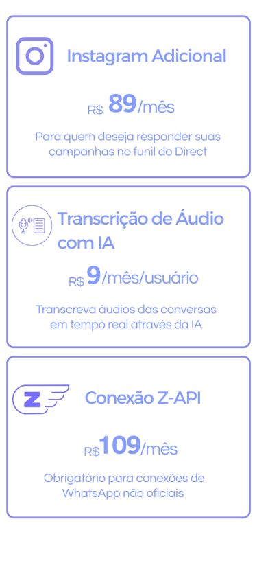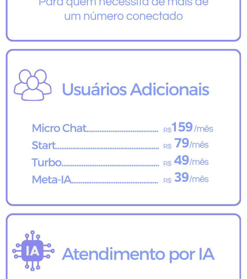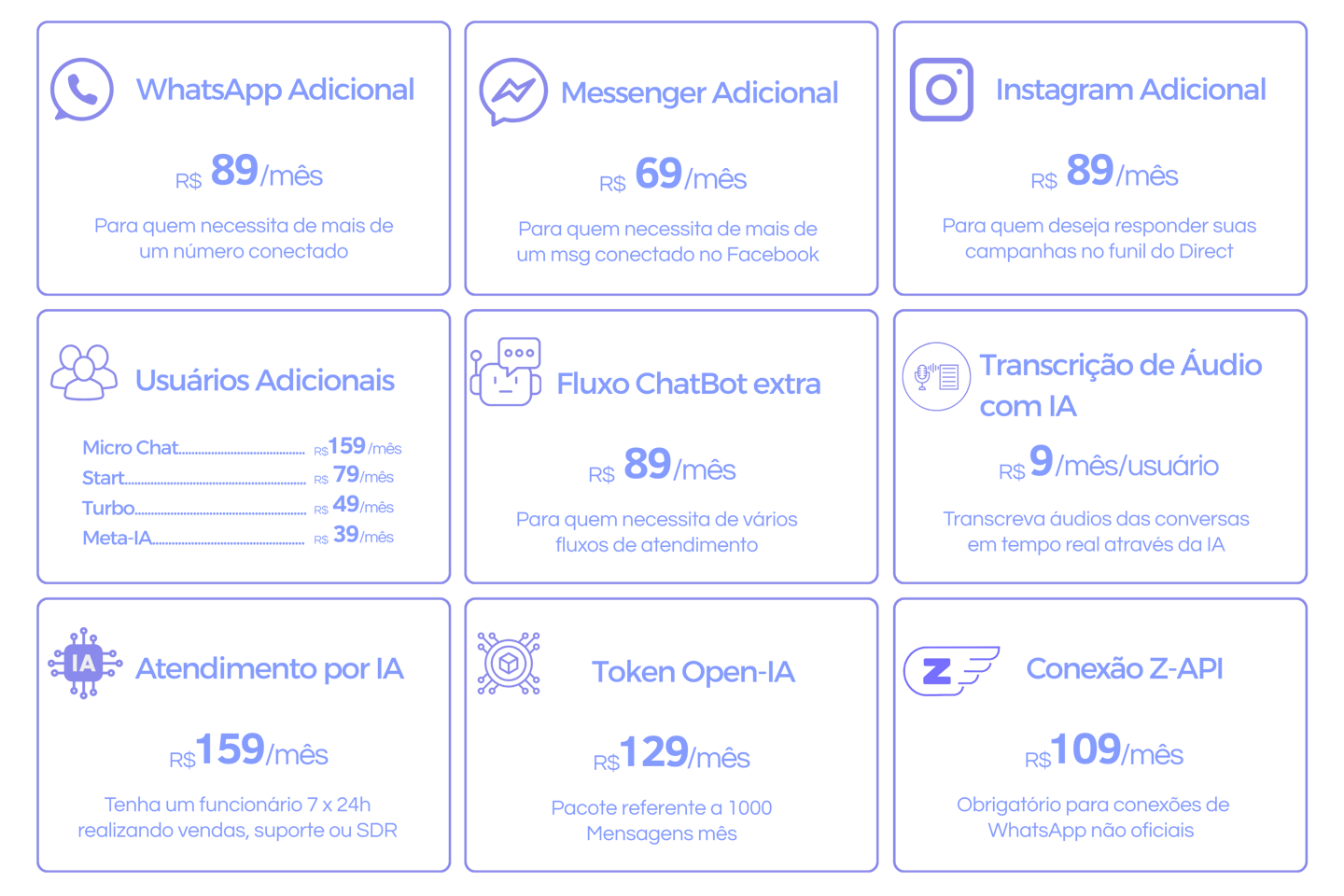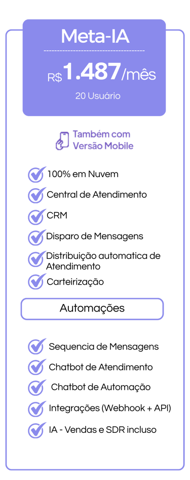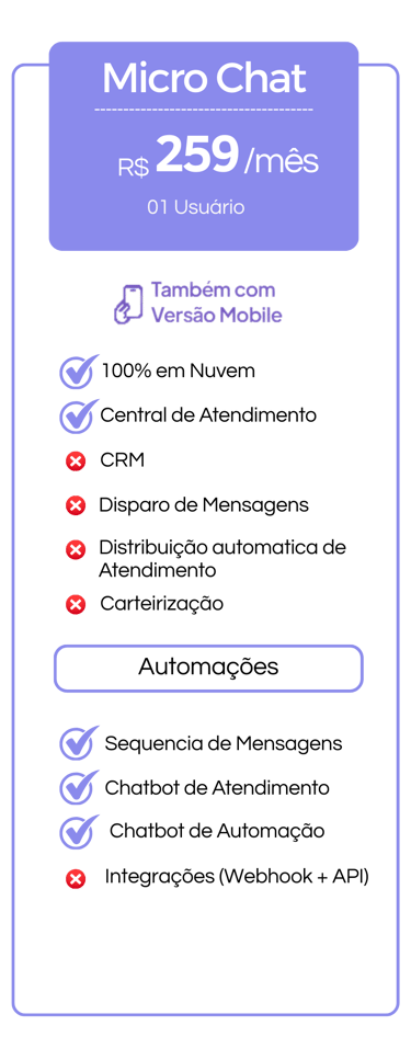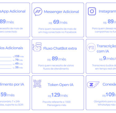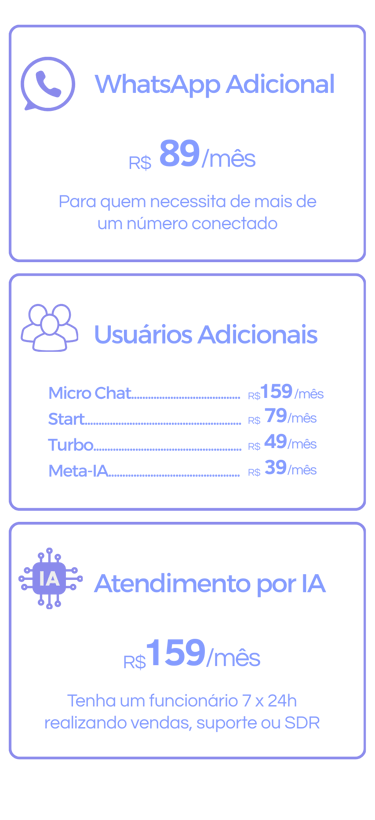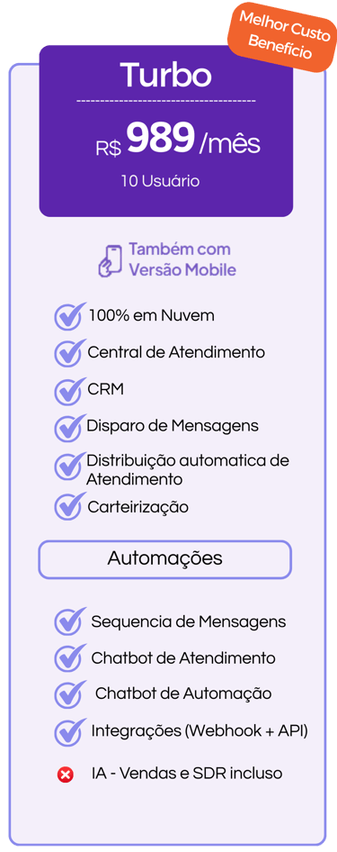 Perfeito para clínicas e prestadores de serviços que precisam de automações avançadas. Oferece recursos completos com suporte técnico e integração de IA para maximizar a eficiência nas vendas.